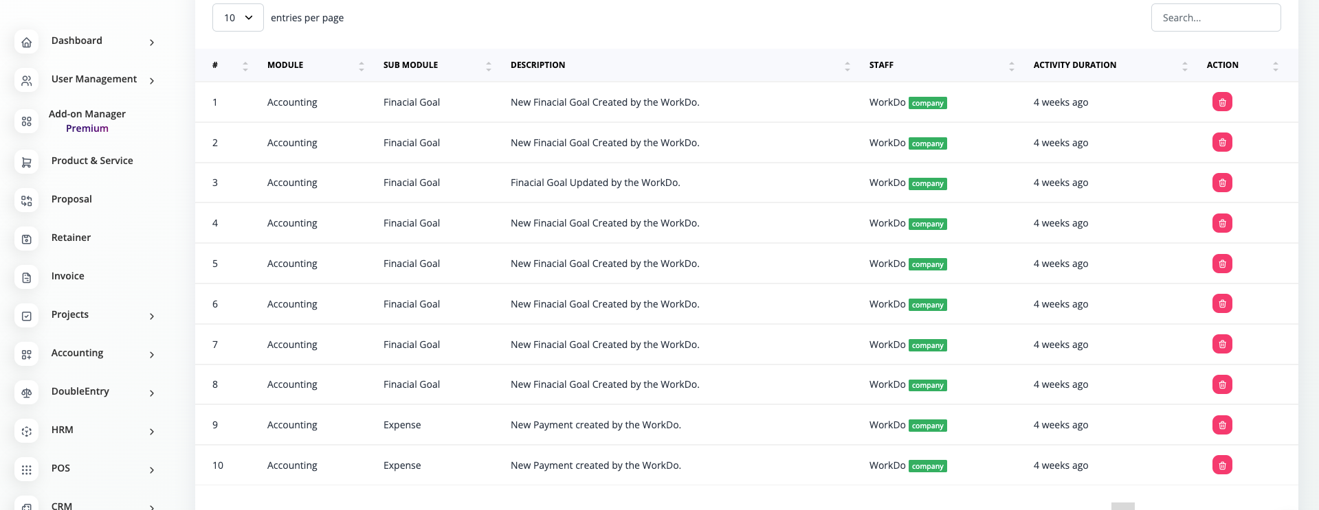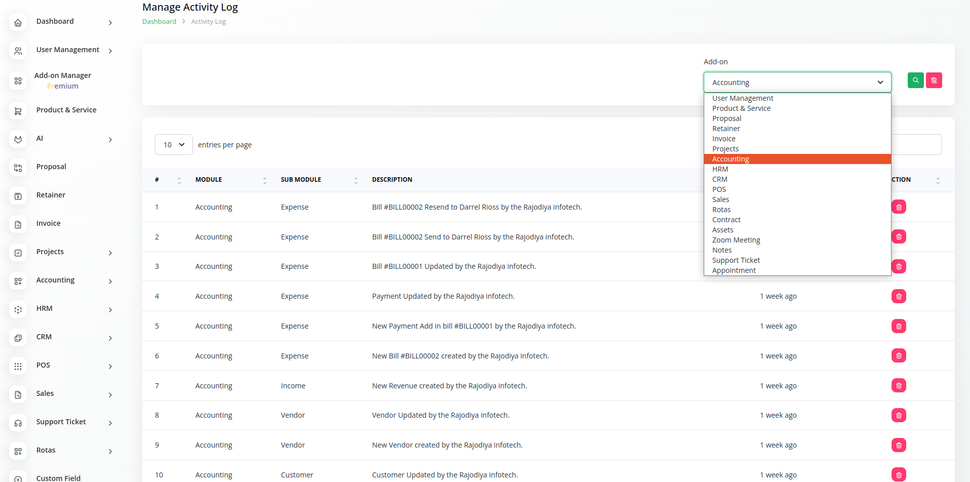 The activity log shows you the activity happening within the modules along with time and according to the appropriate formate. For example, when you create a new object inside any module and edit it, the activity log will show you that activity.