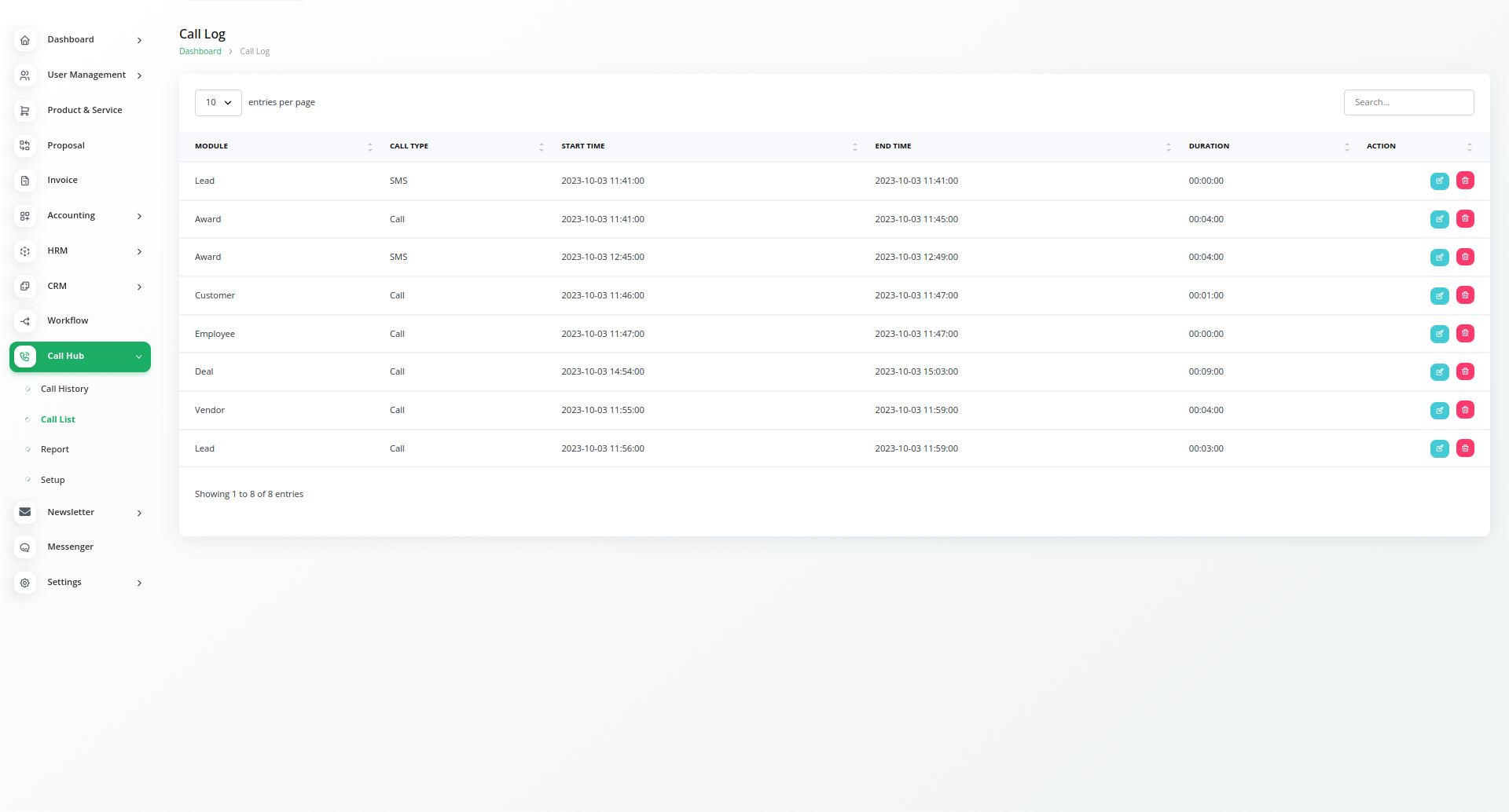 With Call Hub module, a business can see who has answered each call, how long it takes them to answer the call and how long they spend on the particular call or sms.