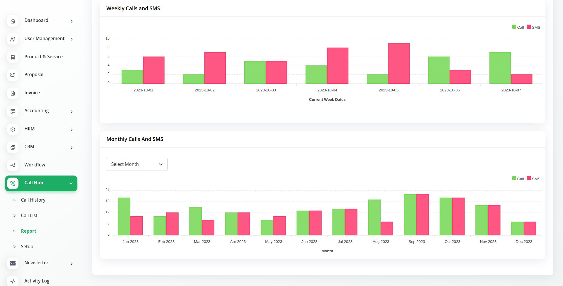 Call Hub provides robust reporting capabilities.Track the number of calls and SMS sent in a given month.Analyze communication patterns for a specific week.