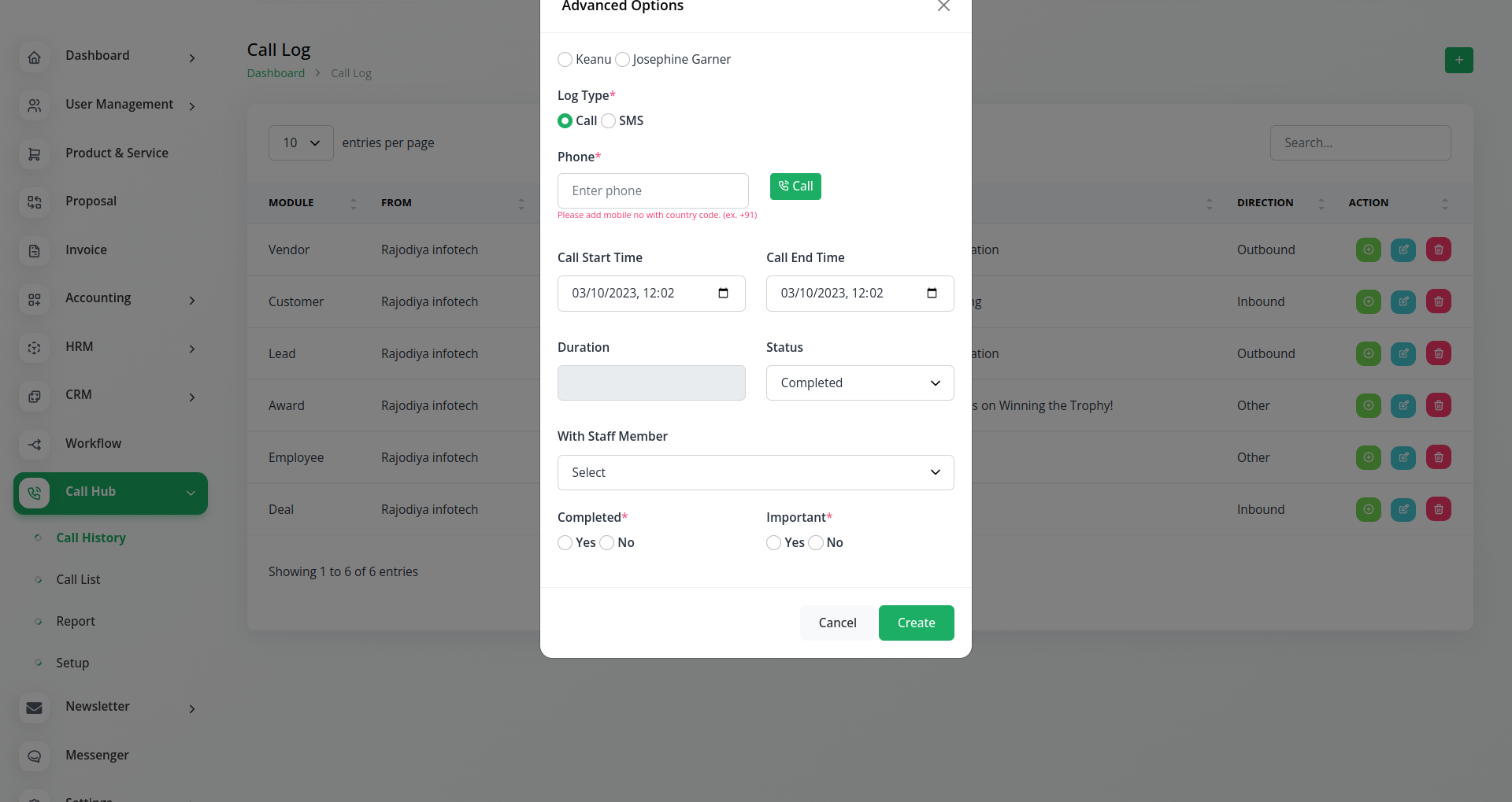 Choosing between a call or SMS communication. From the starting time and the ending time, the duration between that will counted automatically.Assigning a specific user responsible for the call and sms. Writing a custom message to send to the employee, client, or customer. Also this provide a functionality One-click call functionality to reach out to the contact instantly and One-click send message functionality for immediate messaging.