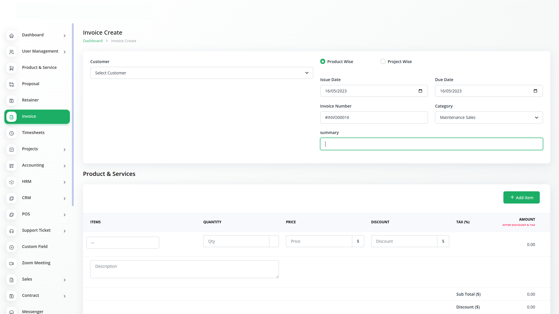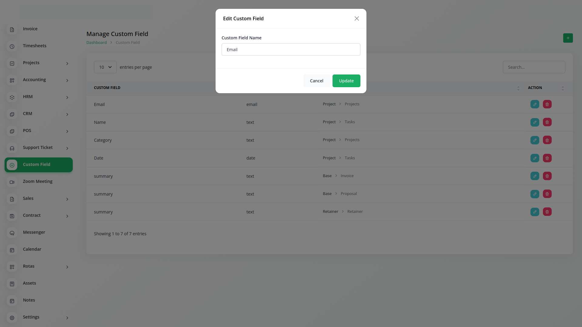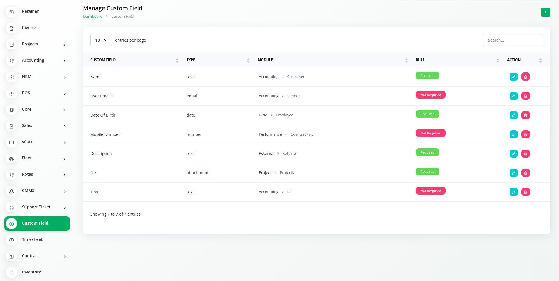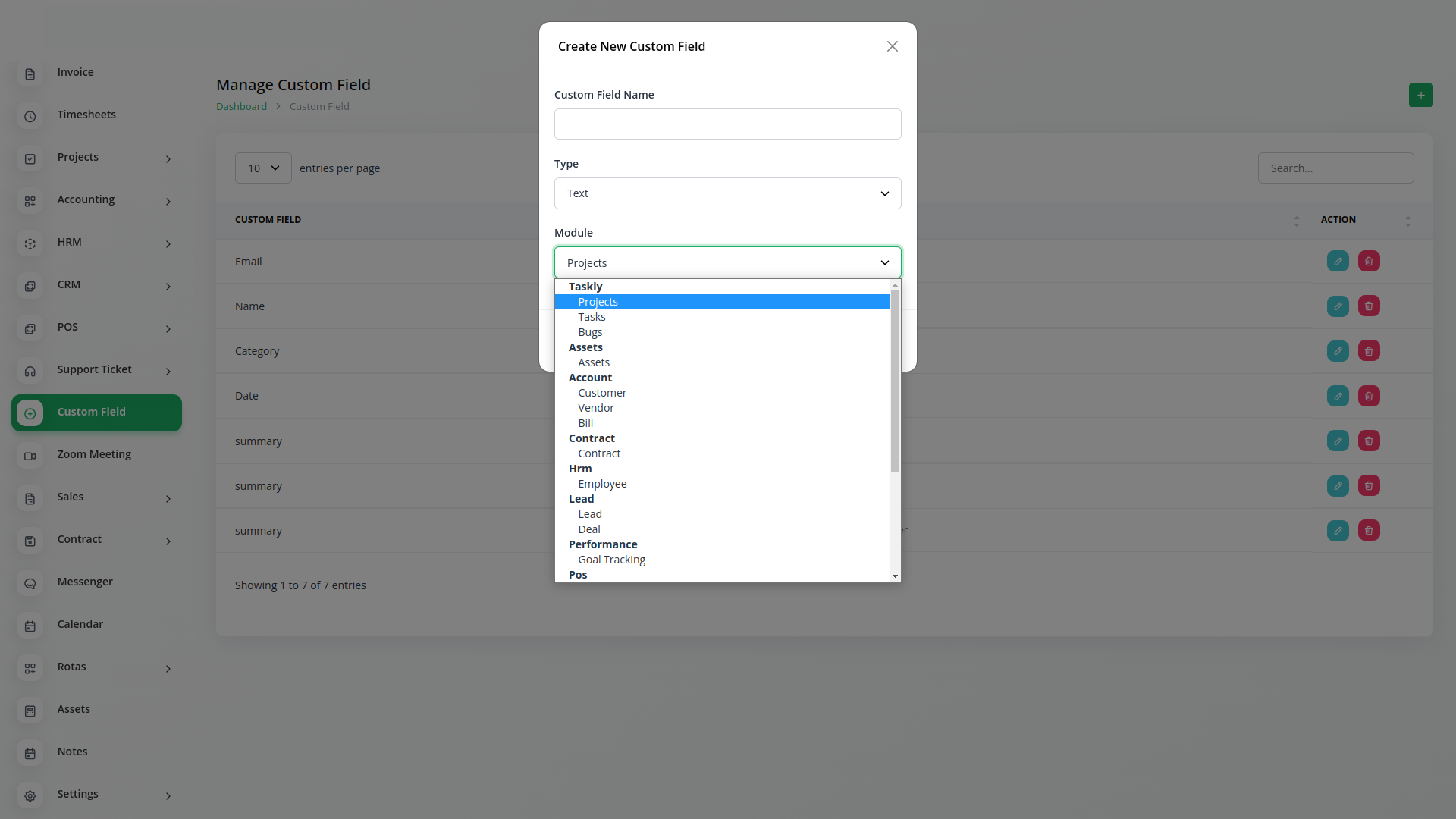 Custom Filed use in HRM, Account, Lead, Assets, Contract, Performance, Pos, Retainer, Sales, Projects and all modules.You can using custom filed collect additional information about all modules as you like.