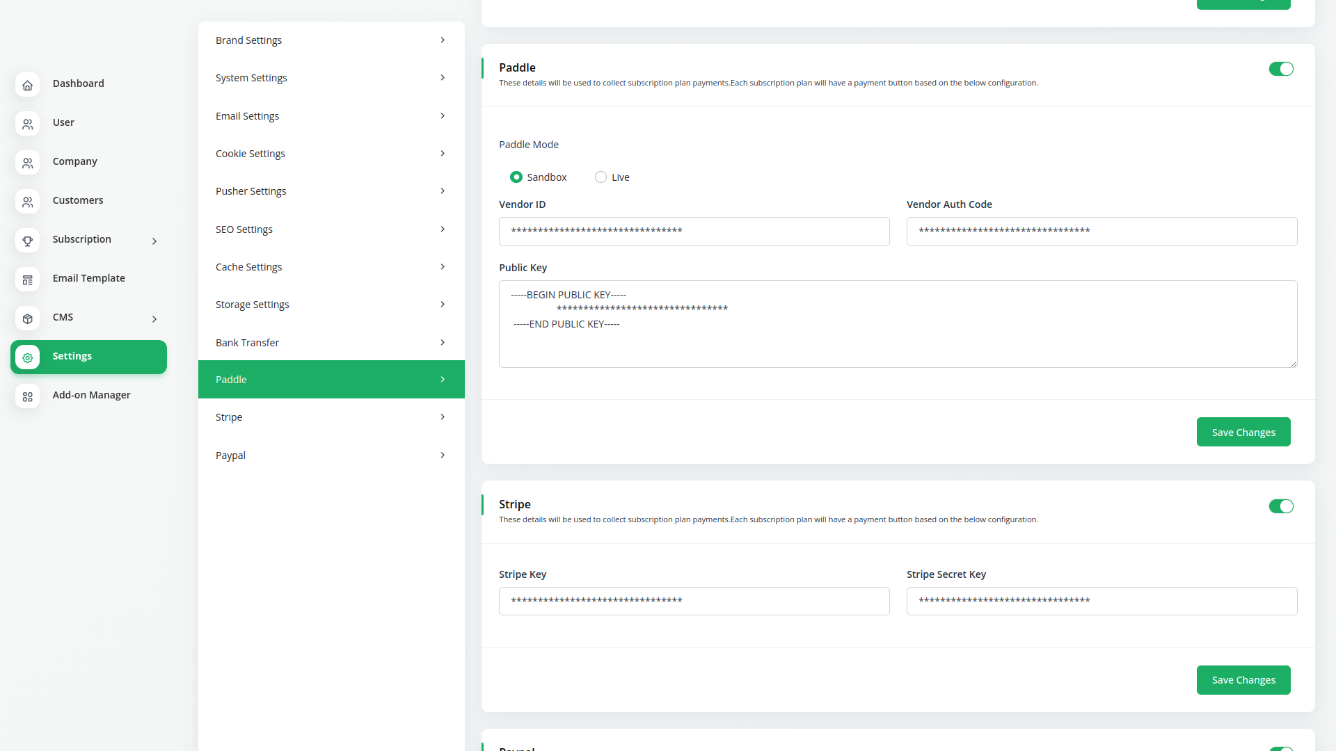 Paddle offers SaaS companies a completely different approach to their payments infrastructure. Instead of assembling and maintaining a complex stack of payments-related apps and services, we’re a merchant of record for our customers, taking away 100% of the pain of payments fragmentation. It’s faster, safer, simpler, and above all, way better.Paddle supports multiple currencies. You can use paddle in Wrkdo-Dash product . First of all you can add your keys in setting page . Make sure your keys are valid.