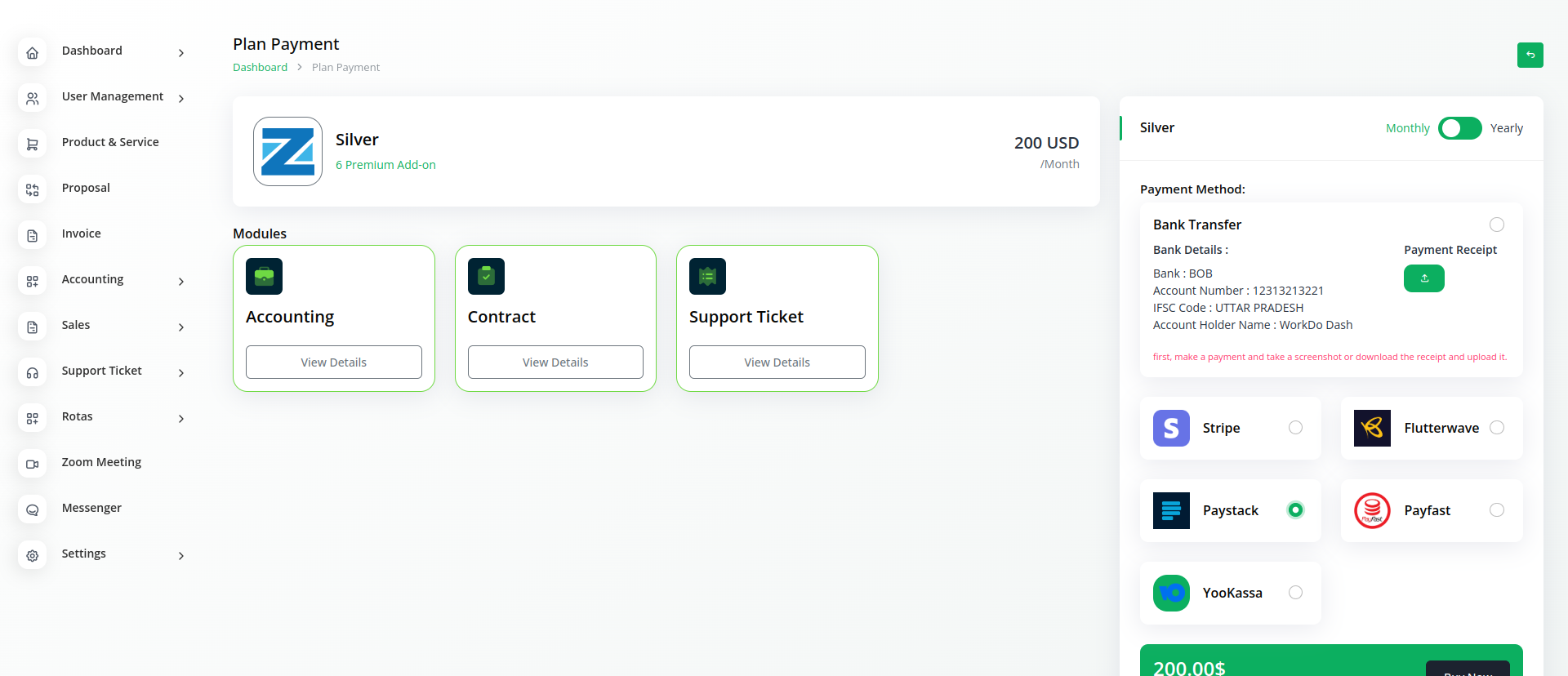 Integrate Paystack to unlock a world of convenience in plan payment management. Seamlessly handle subscriptions, recurring charges, and customised payment plans, all with the ease and reliability of Paystack's secure platform. Trust in Paystack's robust security measures, ensuring each plan payment is processed within a fortified environment, safeguarding sensitive financial data.