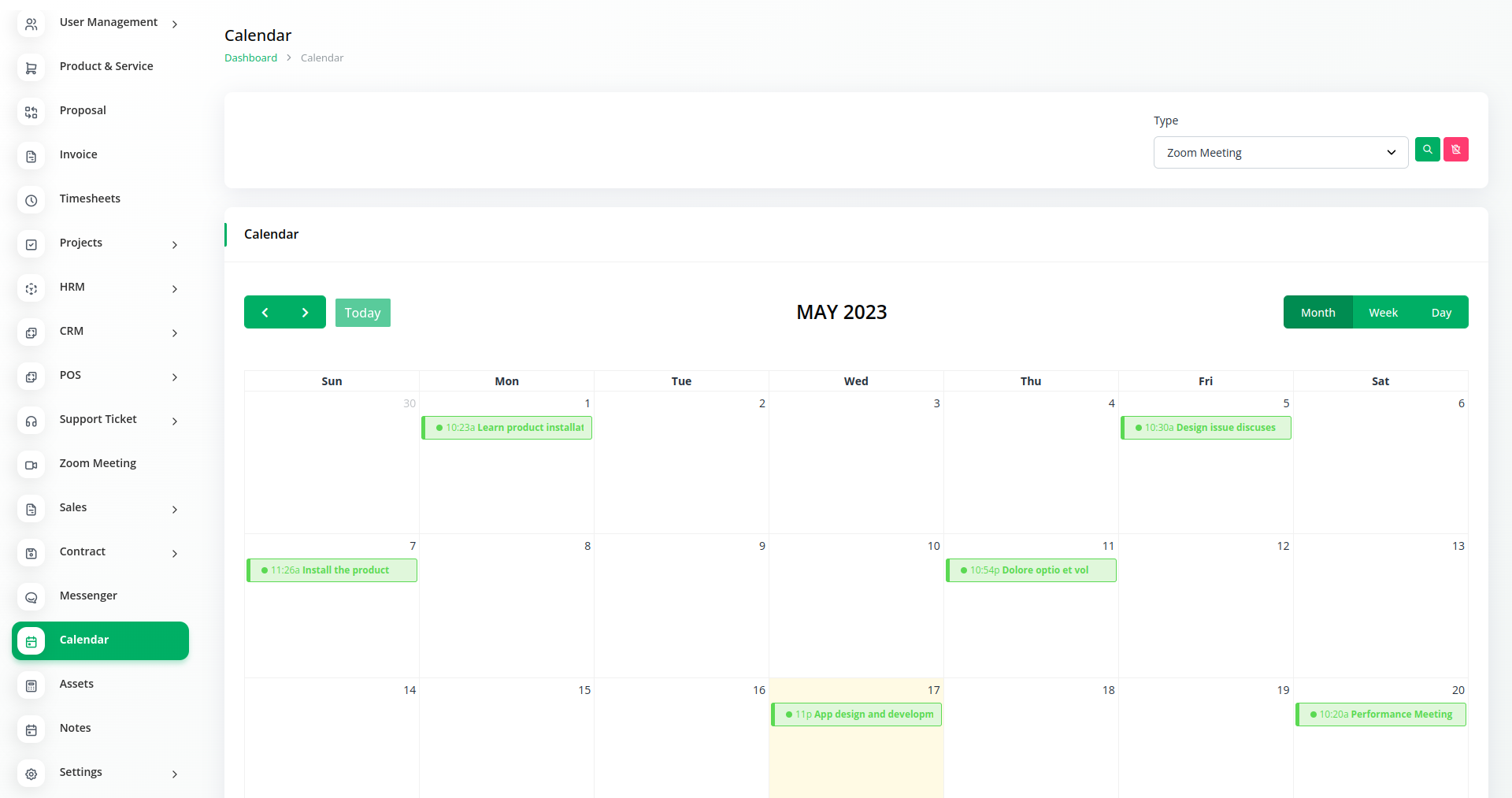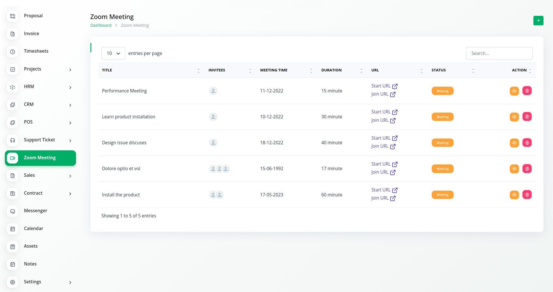Virtual meetings are no new to us. The Zoom Integration provides a platform where you can create a zoom meeting after giving inputs of asked details like; Client, User(s), Meeting Time, and Duration, and it generates a link through which people can join the meeting. You can create, View, Start, and Delete meetings with ease.